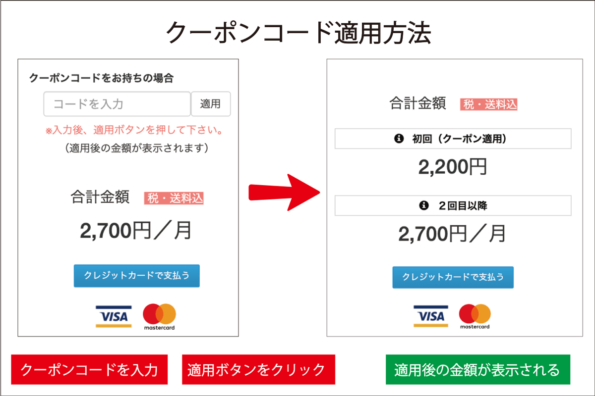 - クーポンをご利用の場合、初回分のお支払いが完了するまでクレジットカード情報の変更はできません。