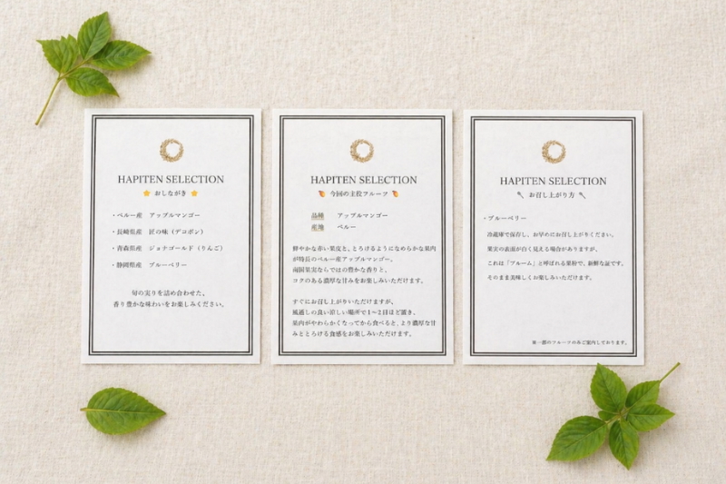 季節に合わせたお花を添えて、華やかなギフト仕様でのお届け。品種と食べ頃を記載した「おしながき」を同梱いたします。ご自宅用にはもちろん、大切な方への贈り物にもそのままご利用いただけます。