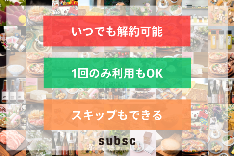 subsc(サブスク)では、いつでも解約(ご利用停止)が可能です。1回のみご利用後の解約もOK!スキップ(1回お休み)も可能です。