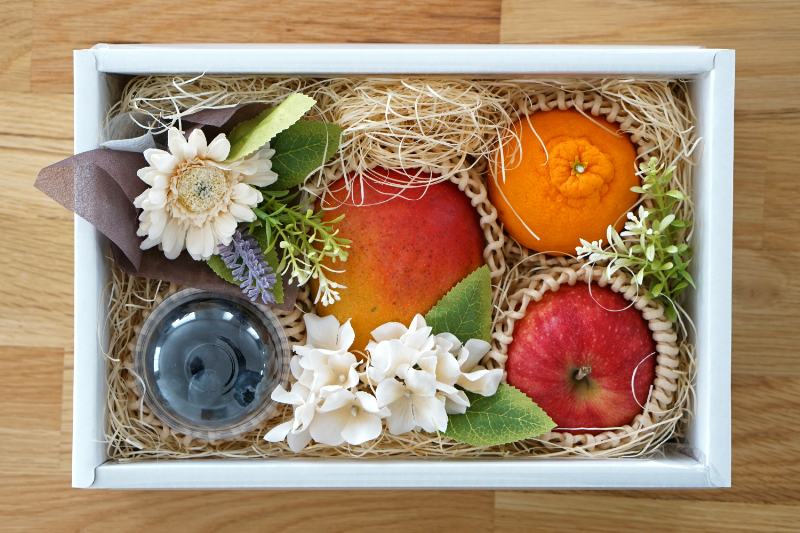 季節に合わせた花が添えられ、丁寧に梱包されたフルーツ