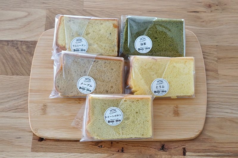 この「ちぎると『しゅわっ』と音がする、有精卵のシフォンケーキ【定期便・5個入り】」では、40種類以上あるフレーバーの中からボン・ムーさんが厳選した5種類のシフォンケーキが毎月届きます。
