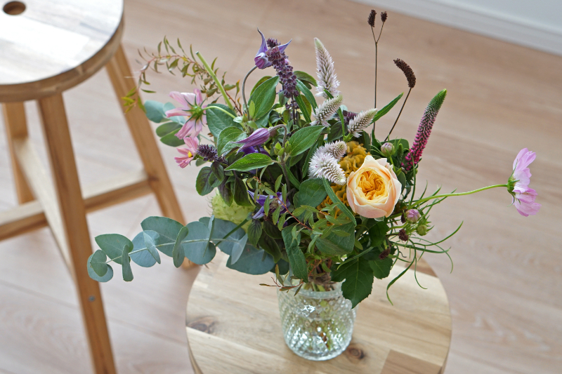 クレマチスやコスモスなどのお花とたっぷりのグリーンが季節を感じさせてくれます。