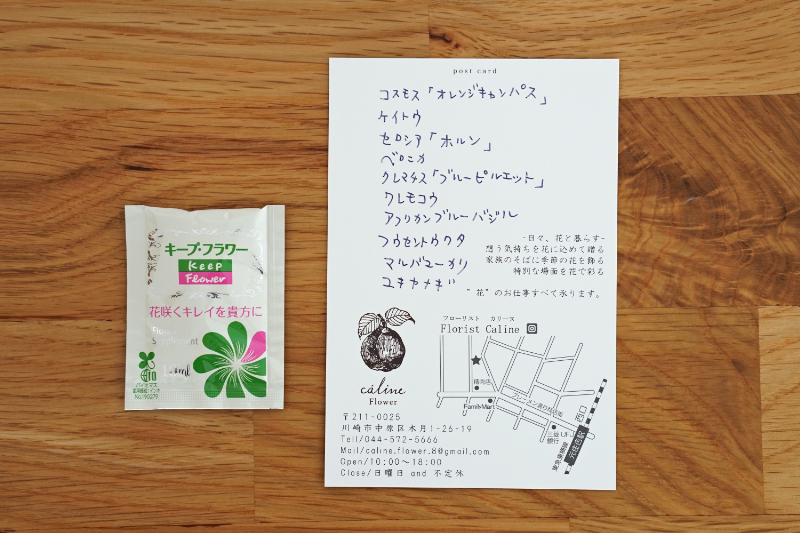 caline(カリーヌ)さんのお花が専用ボックスで到着。ブーケと一緒に、花の名前が書かれたカードも同封されていました。
