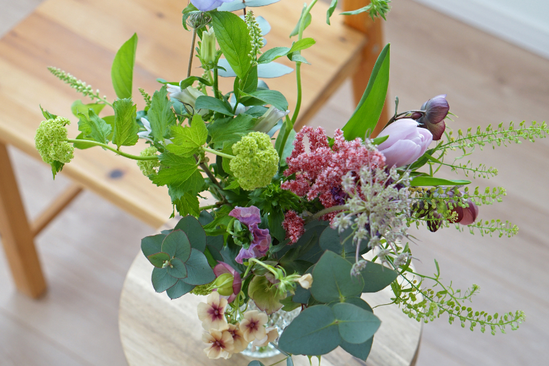 チューリップやカンパニュラなどのお花とたっぷりのグリーンが季節を感じさせてくれます。