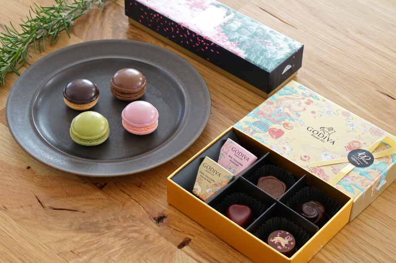 今月は「チョコレートローズ アソートメント(6粒入)」「ゴディバ マカロンショコラ(4個入)」の2種類のスイーツが到着。