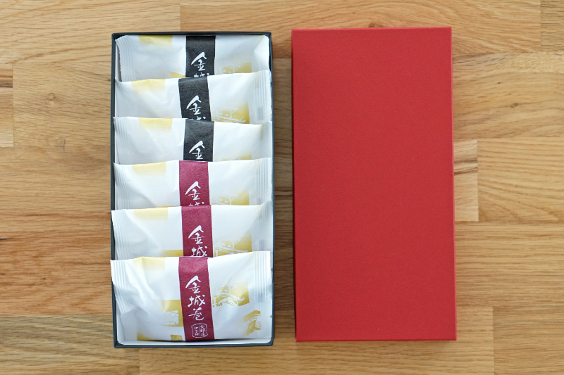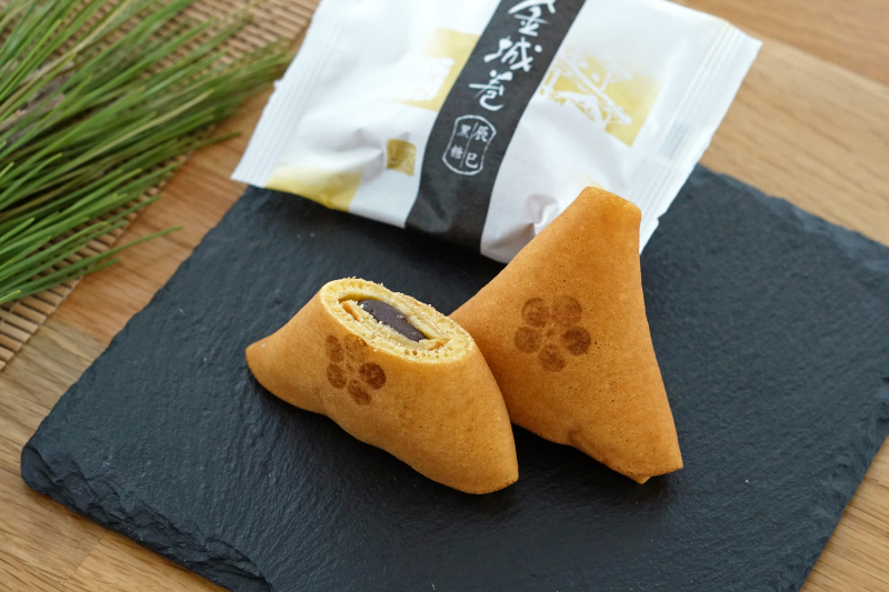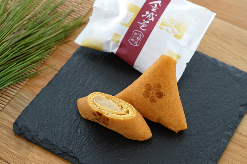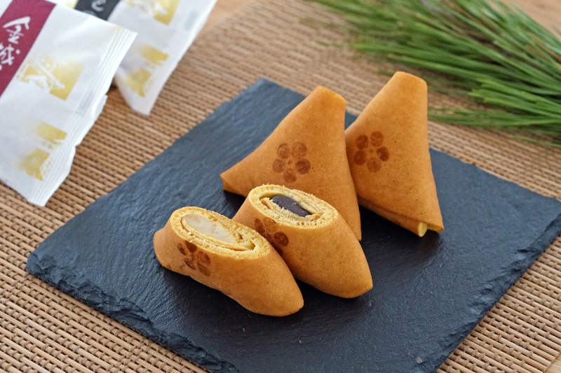 日本3大菓子処のひとつに数えられる加賀百万石の城下町・金沢。藩主が茶道を大切にしたことがその始まり。以来、武家はもちろん庶民の間にも季節や行事に関わる菓子が多く作られてきました。1888年に創業した越山甘清堂の菓子もまた、金沢の菓子文化の伝統を継承。菓子舗を代表する菓子のひとつ「金城巻」は、金沢城と城下町の佇まいを彩る3つの用水から創作されました。三角形は、天守閣や兜をイメージした独特のもの。焼皮には加賀藩主の梅鉢紋を焼き付けて上品に仕上げました。2種類の創作餡と独自のやわらかな生地との組み合わせは、お土産はもちろん、ティータイムのおともにもぴったりです。(同封のカードより)