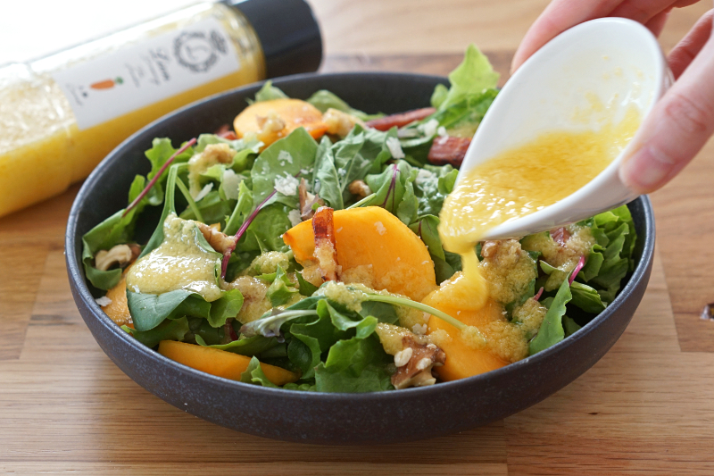 今回は柿、ベビーリーフにベーコンと胡桃をトッピングしたサラダに、この人参ドレッシングをかけていただきました。人参のやさしい甘みが柿の甘さやベーコン、胡桃とよくなじみ、素材の組み合わせをより心地よく感じさせてくれる味わいでした。