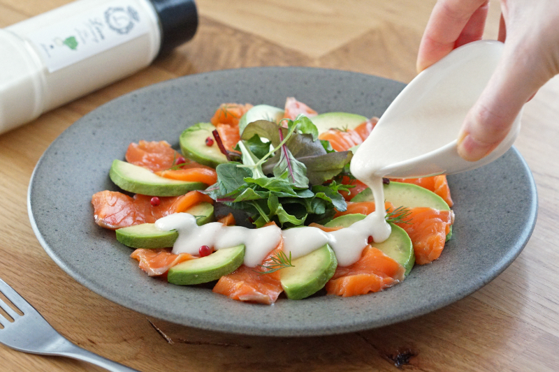 今回は、アボカドとサーモンのカルパッチョに、この蕪のドレッシングを合わせました。蕪のほのかな甘みとやわらかな風味が、サーモンの旨味とクリーミーなアボカドによく合います。素材の味を引き立てながら、全体をやさしくまとめてくれる一皿になりました。