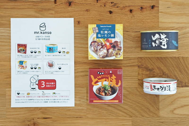 缶詰専門店のパイオニア、mr.kanso (ミスターカンソ)さんが、 約300種類以上の缶詰から “毎月1回・定額” で、ご飯との相性が抜群の缶詰を4〜6缶セレクトしてお届けする 「缶詰のサブスクリプションボックス (定期便) 」です。