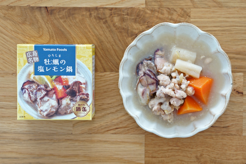 牡蠣の旨味とさっぱり塩レモンの味わいが詰まった、さっぱりした鍋風缶詰。(mr.kanso 缶詰カルテより)