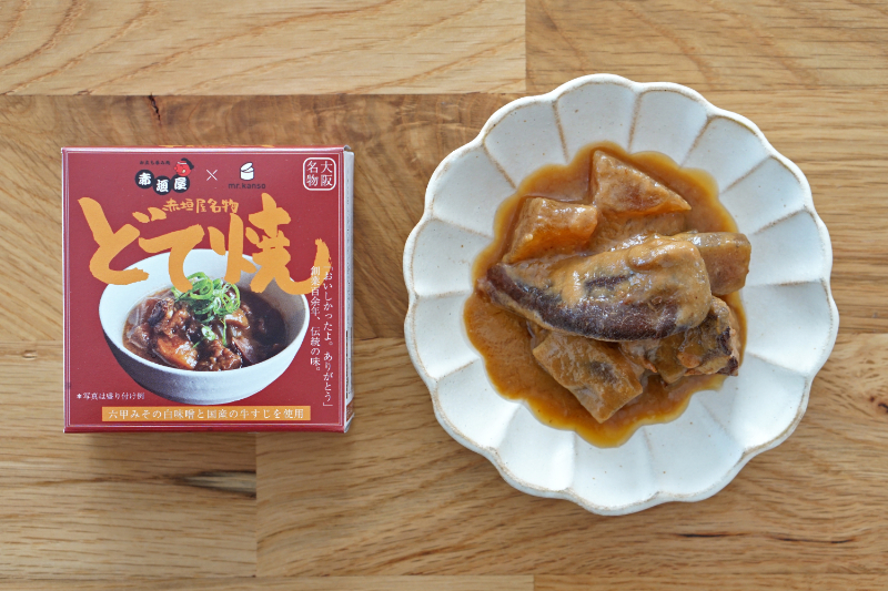 大阪の老舗お立ち呑み処「赤垣屋」と mr.kanso のコラボ。六甲白味噌と国産の牛すじを使用。(mr.kanso 缶詰カルテより)