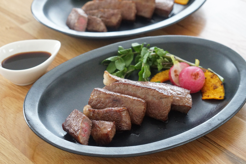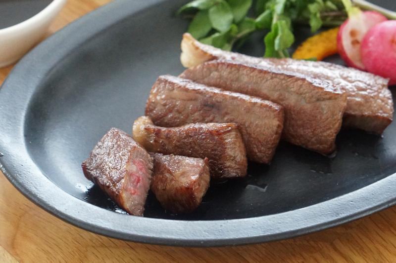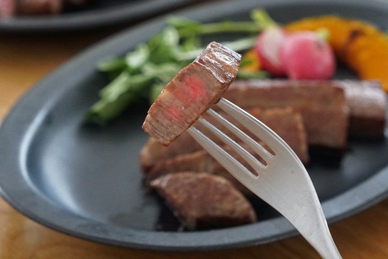 同封されていた牛脂といっしょにステーキ肉を焼き上げ、いよいよ実食です。黒毛和牛の柔らかな食感と弾力、香り、肉汁の旨みが絶品!あまから醤油たれとの相性も抜群です。