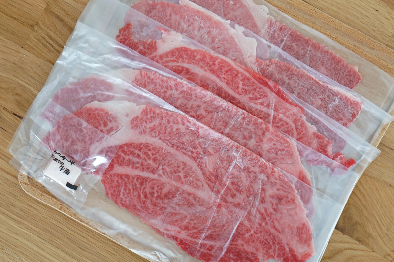 こちらが今月届いた黒毛和牛・すき焼き用(肩・肩ロース)のお肉です。大きくスライスされたお肉が、1枚1枚丁寧に包装されています。