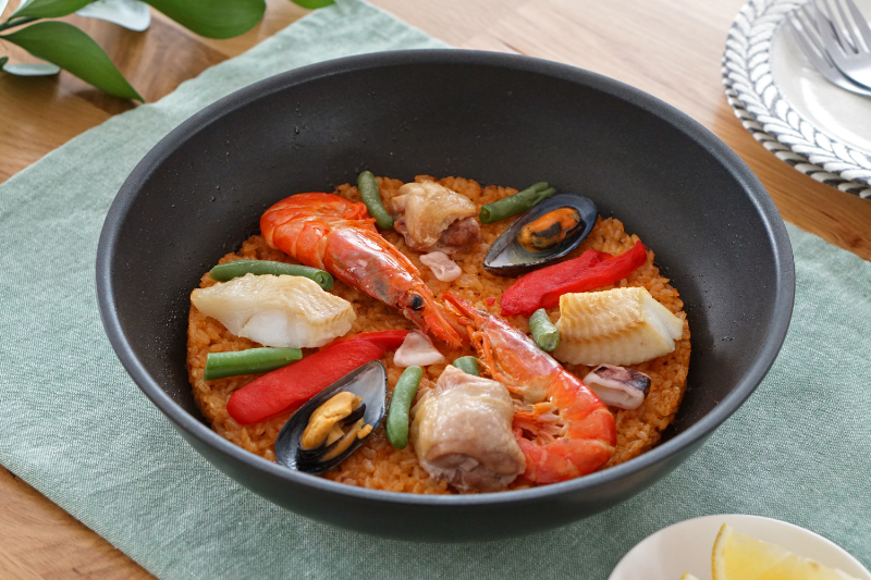 同封されていた調理方法を見ながらパエリアを作っていきます。といっても調理はとても簡単で、冷凍状態のままフライパンに蓋をして蒸し焼きにするだけ(電子レンジ調理も可)。別途用意したレモンを添えていただきました。