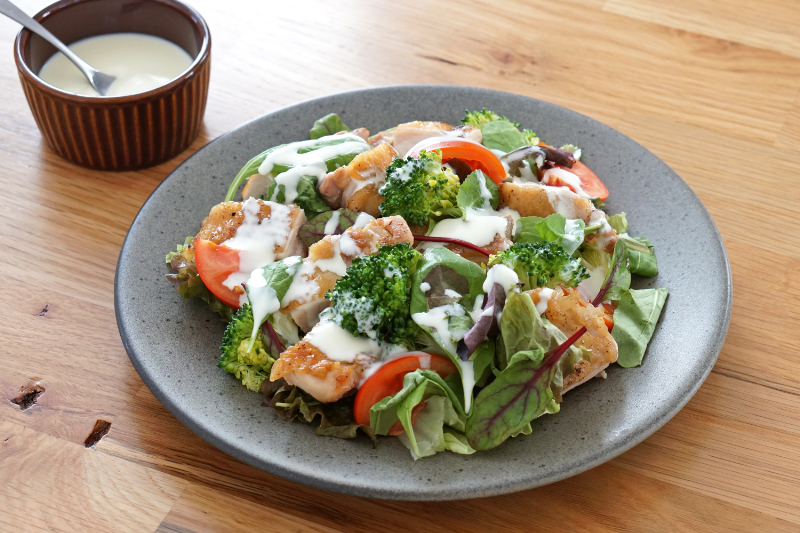 今回はこのクリームチーズを使ったドレッシングを作り、グリルチキンサラダにかけていただきました!クリーミーな味わいのドレッシングがサラダとよく合います。