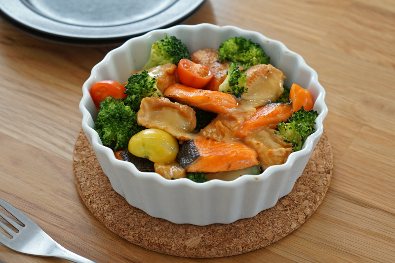 今回は鮭や野菜と一緒にオーブン焼きにしていただきました。とろとろに溶けた味噌の香りのチーズが鮭と相性抜群です!