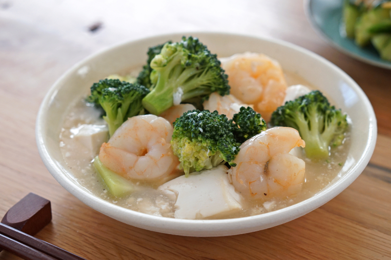 届いたブロッコリーを使って、エビと豆腐と一緒に「ブロッコリーとエビのうま煮」を作りました。ほどよい歯ごたえが残るブロッコリーは甘みがあり、プリッとしたエビの旨味ともよく合います。豆腐にも味がしみて、やさしい味わいの一皿に。ブロッコリーのおいしさをしっかり感じられて、ご飯が進むおかずになりました。