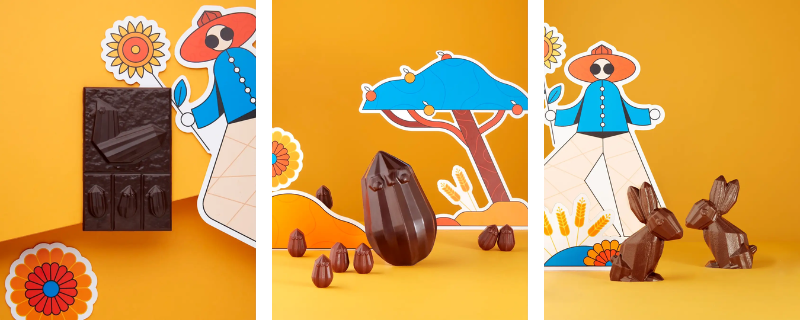 自然の恵みが生み出すカカオポッドの造形に、ウサギ・ヒヨコ・ニワトリなどイースターを象徴する動物を重ねたアーティスティックなデザインが印象的です。鮮やかなオレンジ色のパッケージはパリやカナダでも高評価を受けるイラストレーター、オーレリアン・ジェニーによるもの。カカオ豆の焙煎から一貫製造するショコラティエならではの、産地ごとの個性を活かした味わいも堪能できます。
