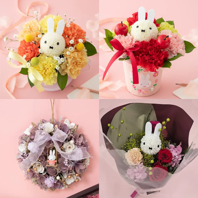 また、アートフラワーや木の皮でできた「ブランコミッフィー リボンリース」(ピンク/パープル)や、プリザーブドフラワーとソラフラワーを組み合わせた「スタンディングブーケ ミッフィーマム」(ピンク/レッド)は花瓶不要でそのまま飾れる仕様で、長く楽しんでもらいたい方への贈り物にも最適です。