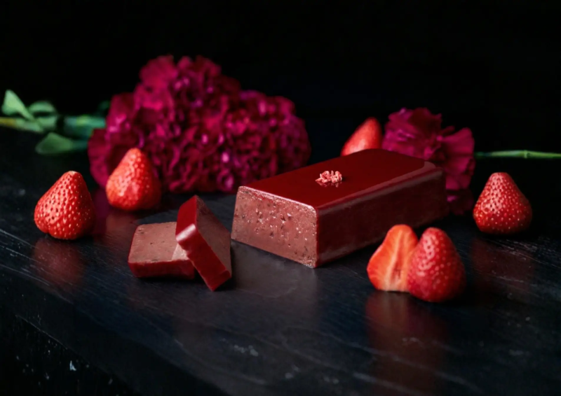 旬のいちごを主役に仕立てたこの商品は、ベリー由来の自然な赤色グラサージュが華やかさを演出し、ひと口でいちごの甘酸っぱさと濃厚なショコラのとろける口どけが広がります。最大の特徴は、オーガニックチアシードで再現したいちご特有の「つぶつぶ感」。ベースには香料を使わずカカオ本来の風味を活かしたオーガニックホワイトチョコレートを厳選するなど、素材にも徹底的にこだわっています。