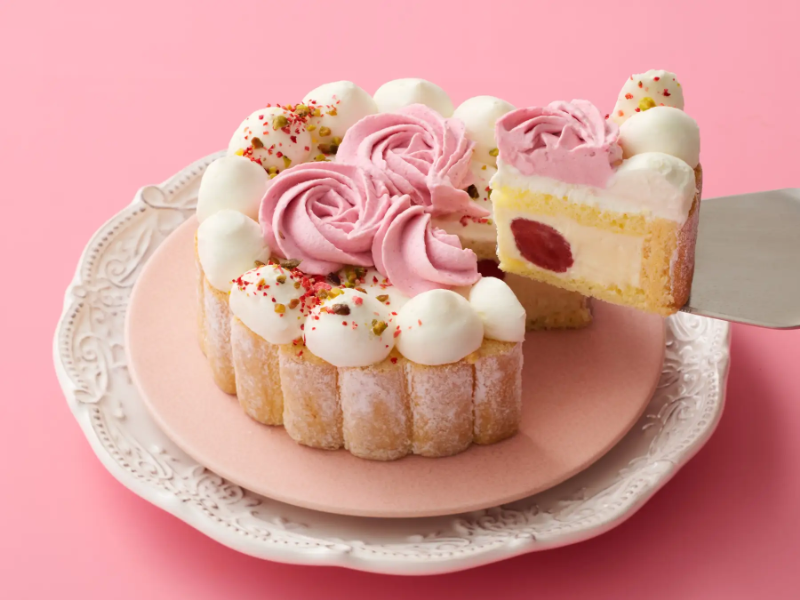 新作「フルールミニョン」は、苺とフランボワーズのピューレで咲かせた天面のお花が印象的なシャルロット仕立てのケーキ。北海道産生クリームのなめらかなミルクシャンティと、マスカルポーネ×練乳のミルキーなムース、ごろっとした苺の果肉が重なり合う华やかな逸品です(3,024円・税込)。