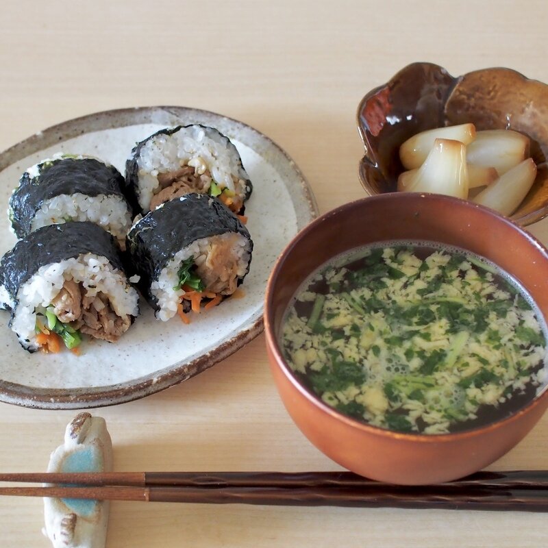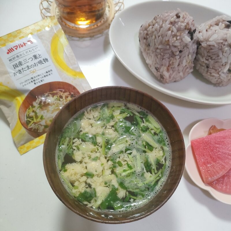 今日は, おにぎりで簡単な朝御飯🍙しかしながら, このお吸い物を加えるだけで料亭の味, いい朝御飯に早変わり😉